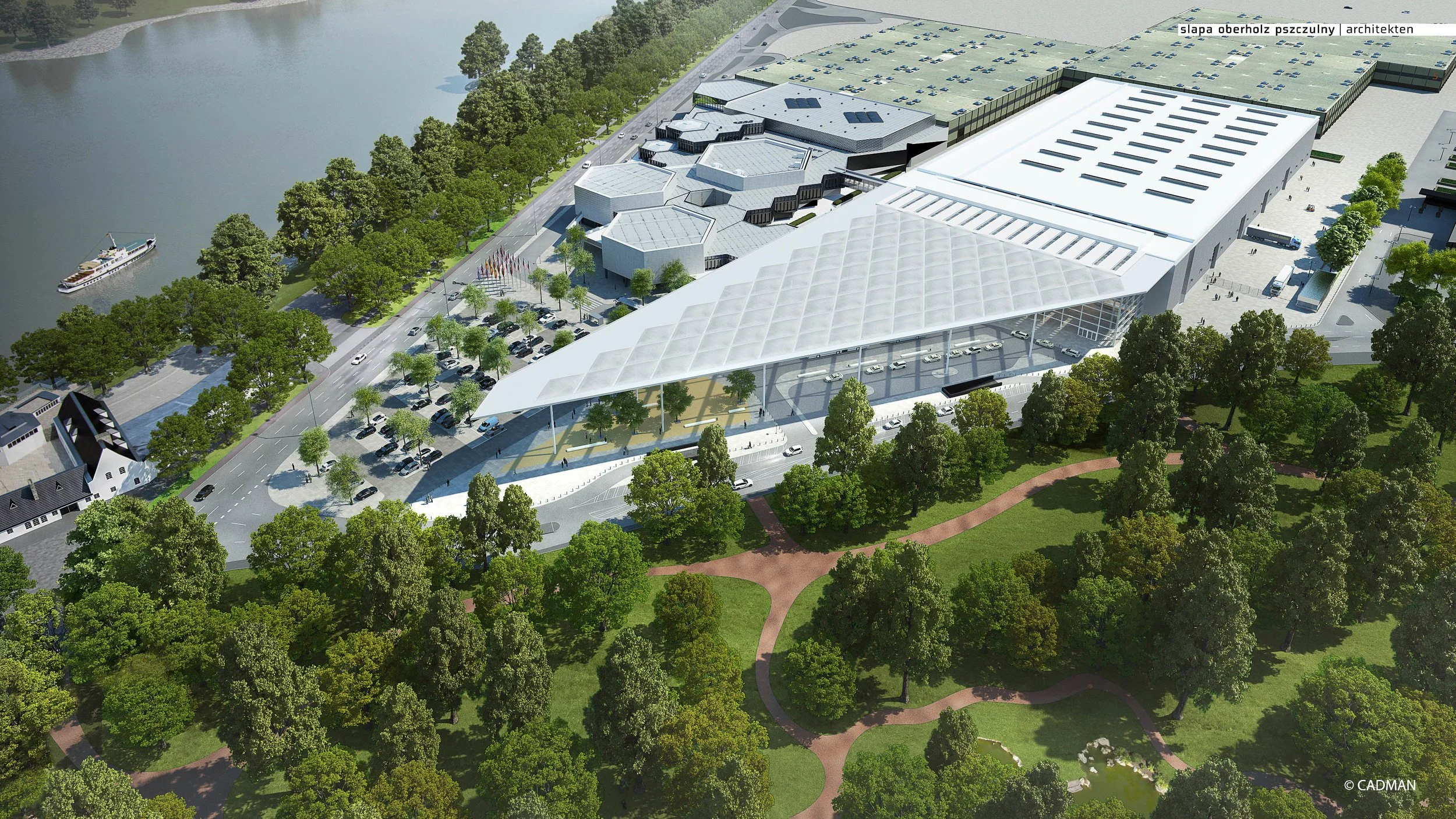 Gegenüber Glas ist es wesentlich leichter, seine Membran ist schmutzabweisend wie Teflon, es ist wirtschaftlicher und hat zudem energetische Vorteile“, erklärt Jurek M. Slapa. Denkbar wäre zudem, Bilder oder Filme anlässlich von Events auf das transparente Dach zu projizieren. Im Konzept berücksichtigt wird auch die einzigartige Lage der Messe Düsseldorf zwischen den beiden riesigen Grünanlagen Rheinufer und Nordpark: So soll sich das Grün nahtlos bis unter das Vordach ziehen und die Wege zum Rhein werden erweitert, um zum Relaxen an der Promenade einzuladen.