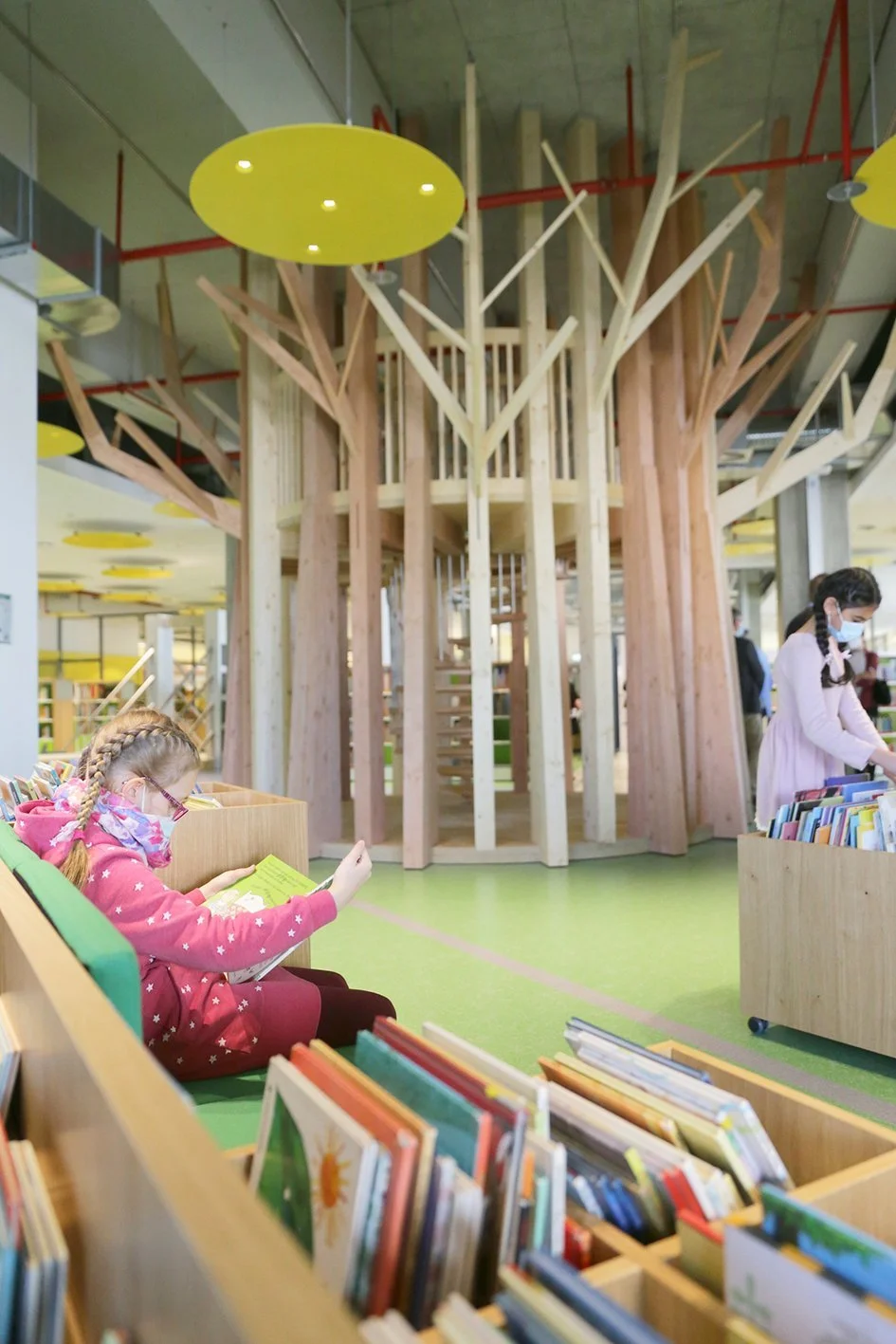 Ein Highlight der Kinderbibliothek ist das wunderschön gestaltete Baumhaus aus Holz, das bis zur Decke reicht.